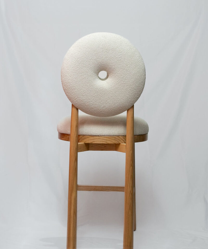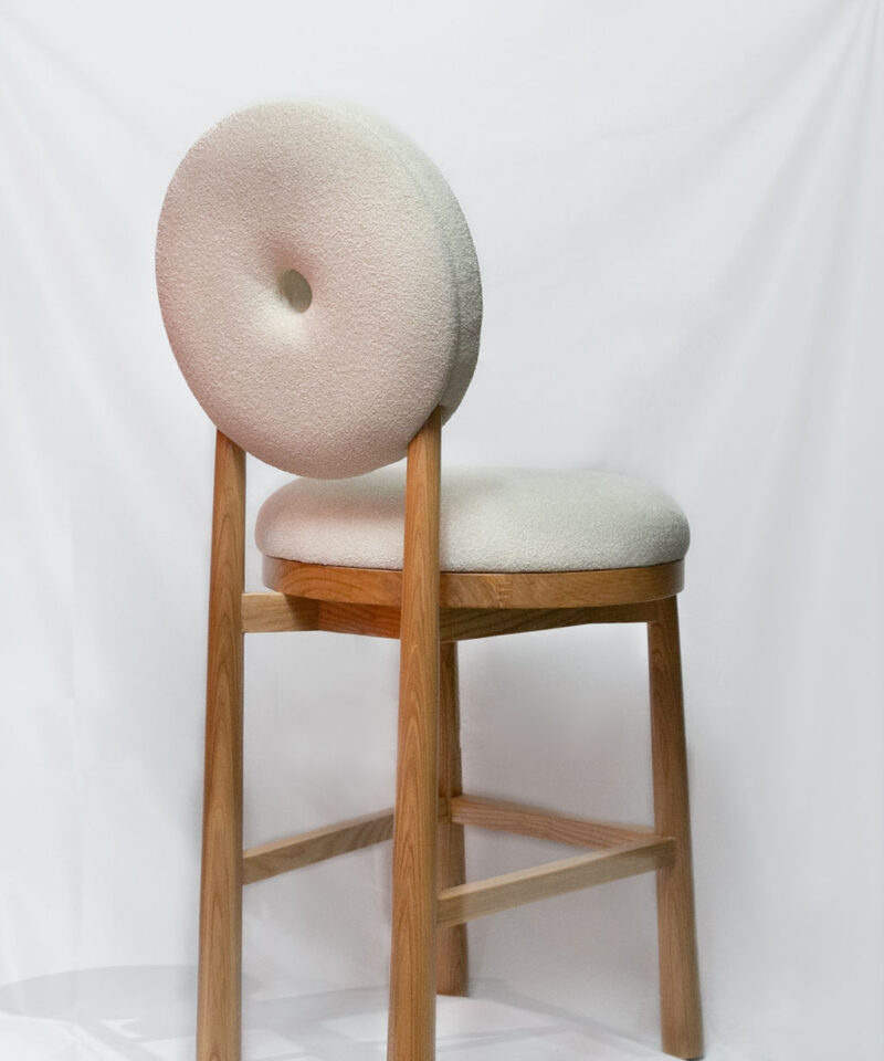 Comodisima silla con altura de taburete de cocina, estructura de haya color natural y tapizada en boucle crudo en respaldo y asiento.