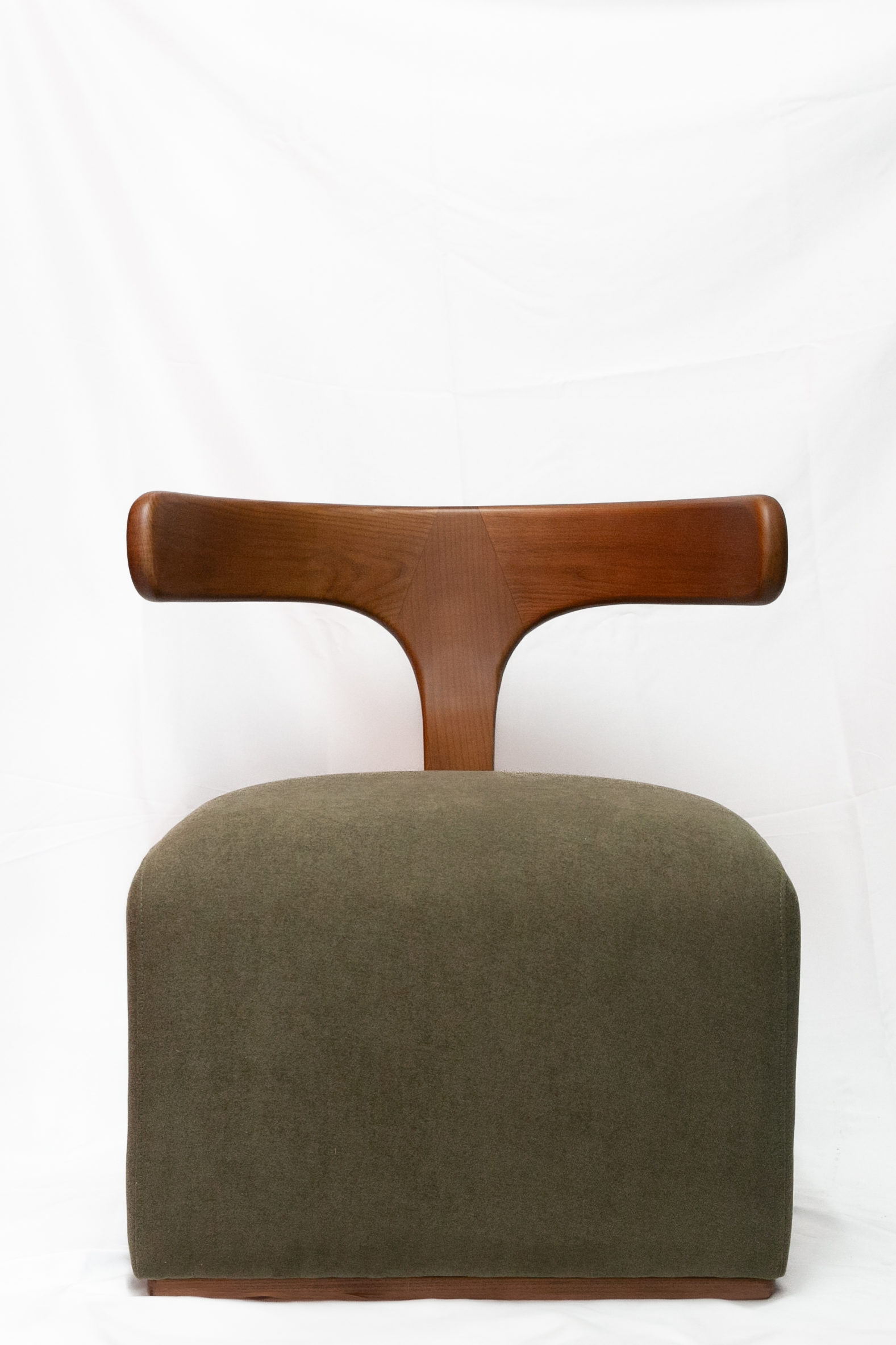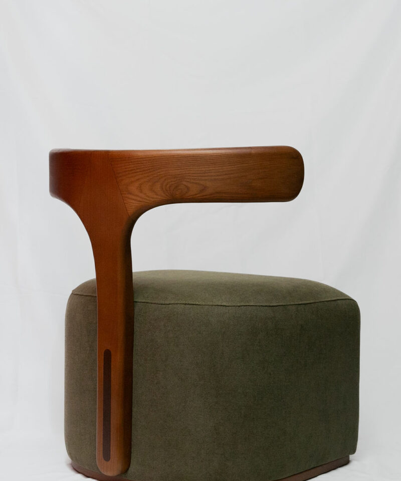 Sillón de respaldo de madera natural en color caramelo y marquetería en forma de “T”, asiento acolchado completamente en terciopelo verde botella.